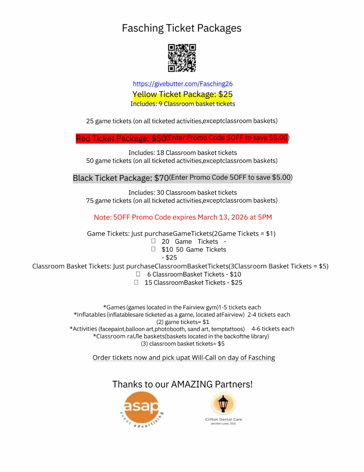 What is Fairview's Fasching? The Fairview Fasching carnival is the school's largest Fundraising event and will be held on Saturday, March 14, 2026 from 12pm - 4pm.