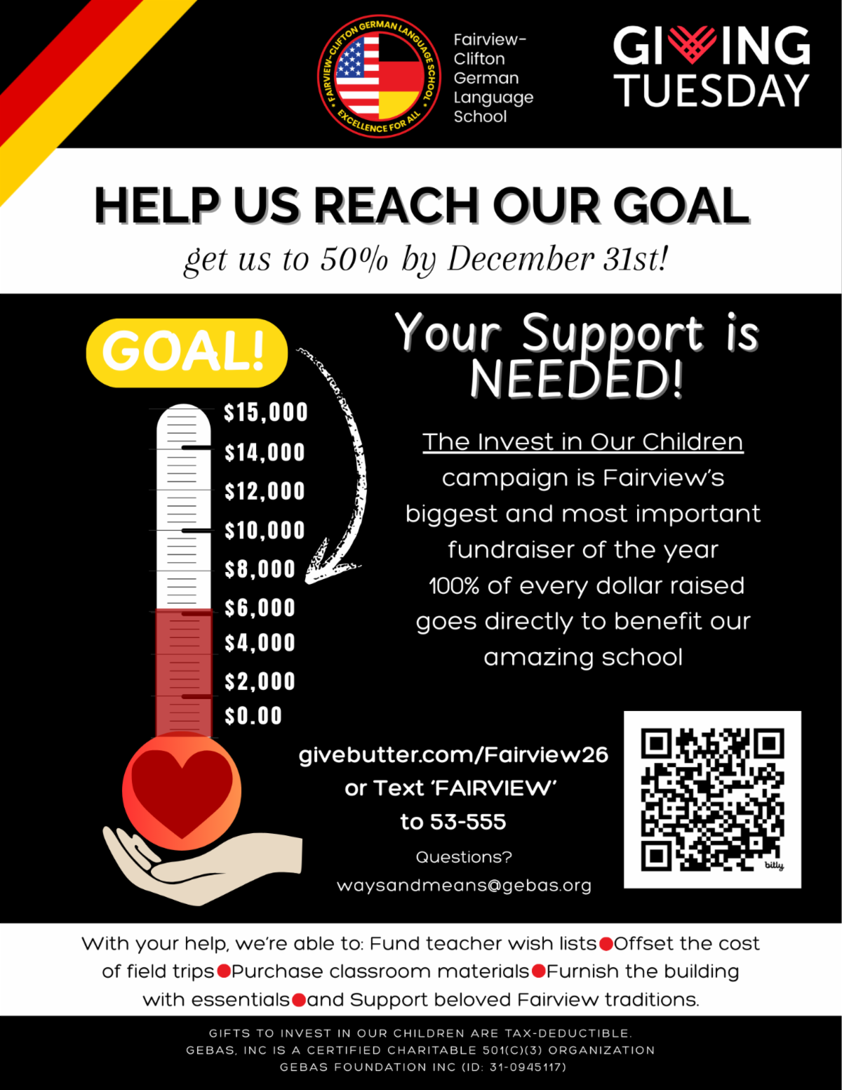 Gifts to Invest in Our Children are 100% guaranteed contribution to GEBAS and Fairview-Clifton German Language School.