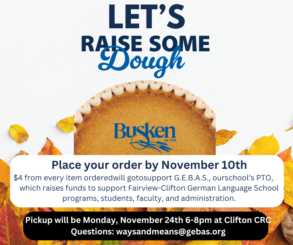 $4 from every item ordered will go to support G.E.B.A.S., our school’s PTO, which raises funds to support Fairview-Clifton German Language School programs, students, faculty, and administration.